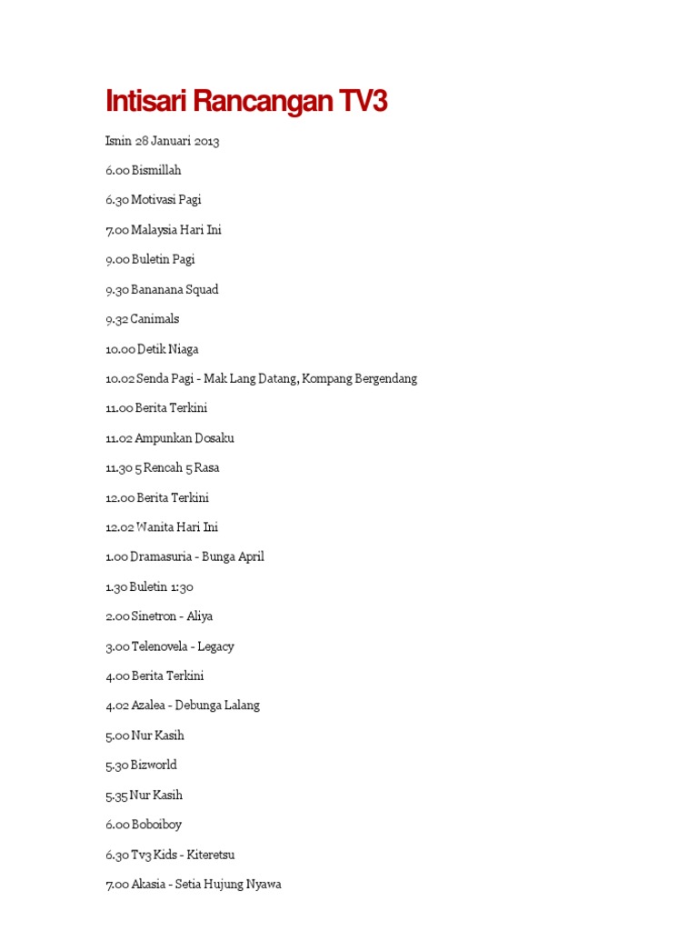 Pastikan anda menonton klip-klip video terkini Buletin TV3 dan strim live Buletin Utama Buletin 130 Buletin Pagi dan Nightline di laman web Berita Harian. TV3 Malaysia Live Streaming TV3 is a Malaysian private free-to-air television channel owned and operated by the Media Prima Berhad a Malaysian conglomerate. Monday to Sunday 12am.